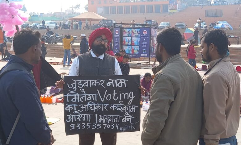 नैनी, प्रयागराज। भारतीय जनता पार्टी अल्पसंख्यक मोर्चा काशी क्षेत्र के क्षेत्रीय उपाध्यक्ष सरदार पतविन्दर सिंह ने अरैल घाट संगम क्षेत्र में मतदाता जागरूकता अभियान चलाया। इस दौरान वे हाथों में प्ले-कार्ड और बैनर लेकर स्नान के लिए आए युवाओं, युवतियों और श्रद्धालुओं से लगातार अपील करते नजर आए कि वे मतदाता पुनरीक्षण अभियान के अंतर्गत अपना नाम मतदाता सूची में अवश्य दर्ज कराएं।