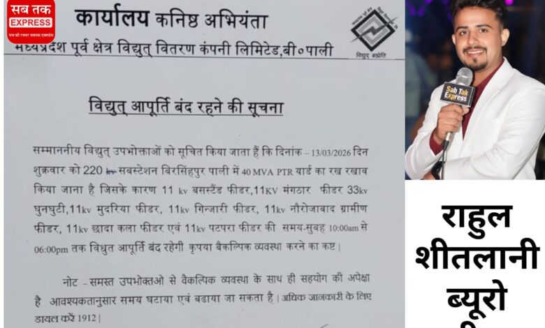 पाली (उमरिया)। मध्यप्रदेश पूर्व क्षेत्र विद्युत वितरण कंपनी लिमिटेड के कनिष्ठ अभियंता कार्यालय, बी.आर.एस. पाली द्वारा जारी सूचना के अनुसार 13 मार्च 2026 दिन शुक्रवार को 220 केवी सबस्टेशन बिरसिंहपुर पाली में 40 MVA PTR यार्ड के रखरखाव कार्य के कारण कई क्षेत्रों में विद्युत आपूर्ति बंद रहेगी।