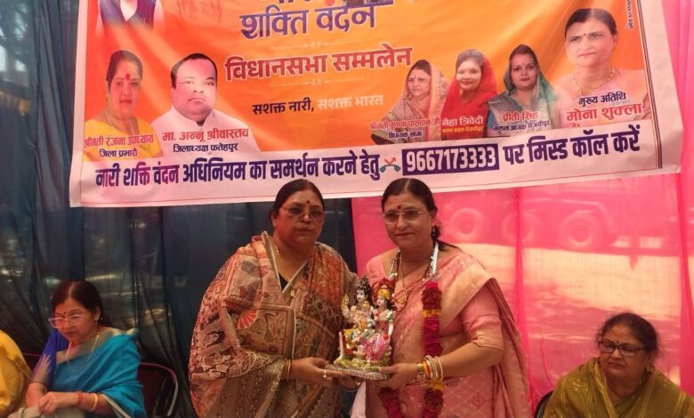 विजयीपुर, फतेहपुर। विजयीपुर ब्लॉक परिसर में गुरुवार को भारतीय जनता पार्टी की ओर से नारी शक्ति वंदन सम्मेलन का भव्य आयोजन किया गया। कार्यक्रम में क्षेत्र की बड़ी संख्या में महिलाओं ने उत्साहपूर्वक भाग लिया और महिला सशक्तिकरण से जुड़े विभिन्न मुद्दों पर अपने विचार साझा किए।