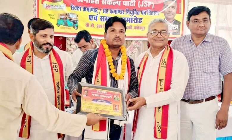 बिंदकी विधानसभा क्षेत्र के ईरा गार्डेन, कोराई में जनहित संकल्प पार्टी (JSP) द्वारा आयोजित सेक्टर कमांडर एवं सह सेक्टर कमांडर नियुक्ति पत्र वितरण एवं सम्मान समारोह ने क्षेत्र की राजनीतिक हलचल को तेज कर दिया। कार्यक्रम में बड़ी संख्या में कार्यकर्ताओं और स्थानीय लोगों की भागीदारी ने पार्टी की बढ़ती सक्रियता को साफ दर्शाया।
