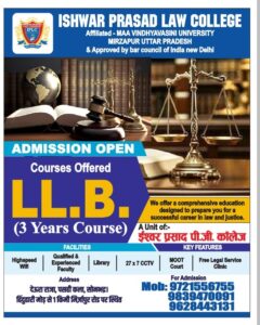 विधि क्षेत्र में करियर बनाने के इच्छुक युवाओं के लिए खुशखबरी! इश्वर प्रसाद लॉ कॉलेज, सोनभद्र ने एल.एल.बी. (3 वर्ष) पाठ्यक्रम में प्रवेश प्रक्रिया प्रारंभ कर दी है। यह कॉलेज मा. विन्ध्यवासिनी विश्वविद्यालय, मिर्जापुर, उत्तर प्रदेश से संबद्ध है तथा बार काउंसिल ऑफ इंडिया, नई दिल्ली से अनुमोदित है।